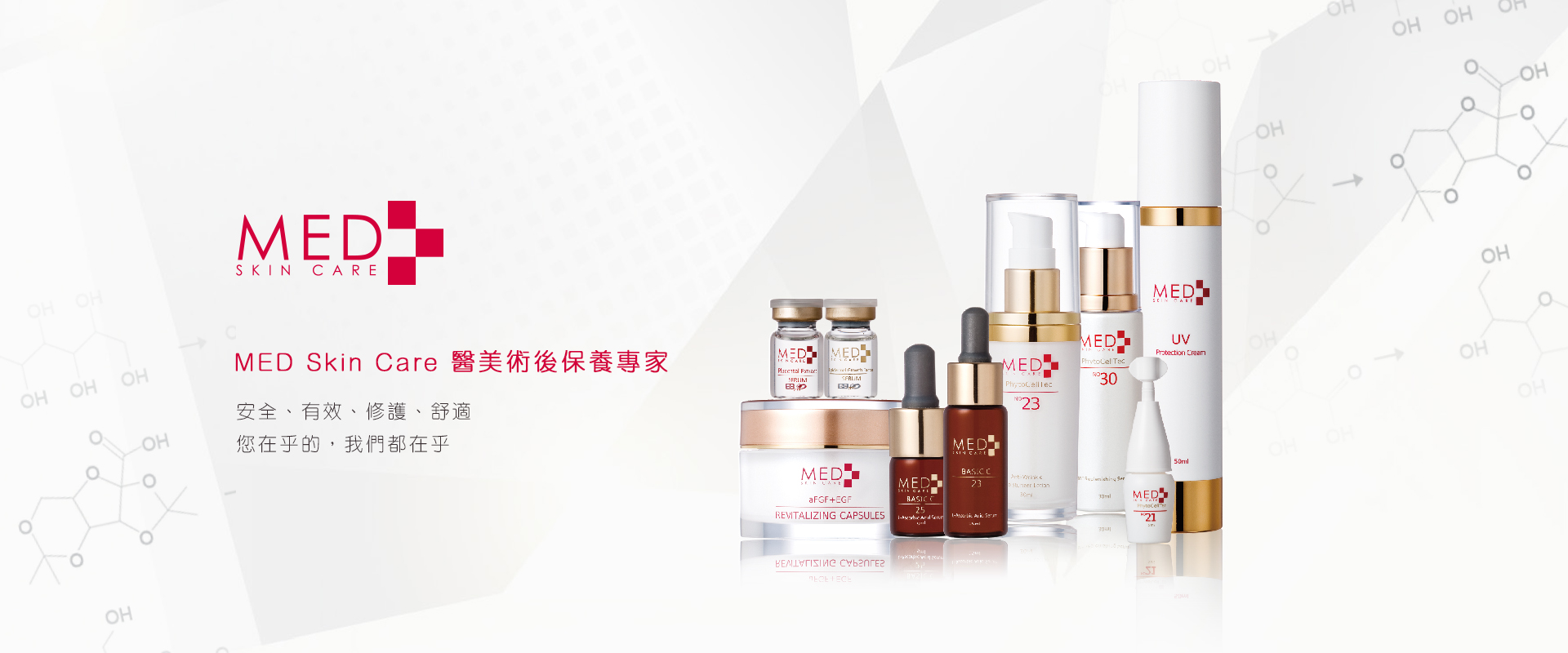 MED SKIN CARE was founded in Taiwan 2006, in cooperation with many GMP/ ISO accredited cosmeceutical and pharmaceutical factories and research institutes all over the world for making extraordinary anti-aging and medical skin care products. Our products are sold in professional beauty salons, clinics, and hospitals in Taiwan, China, and Southeast Asia.